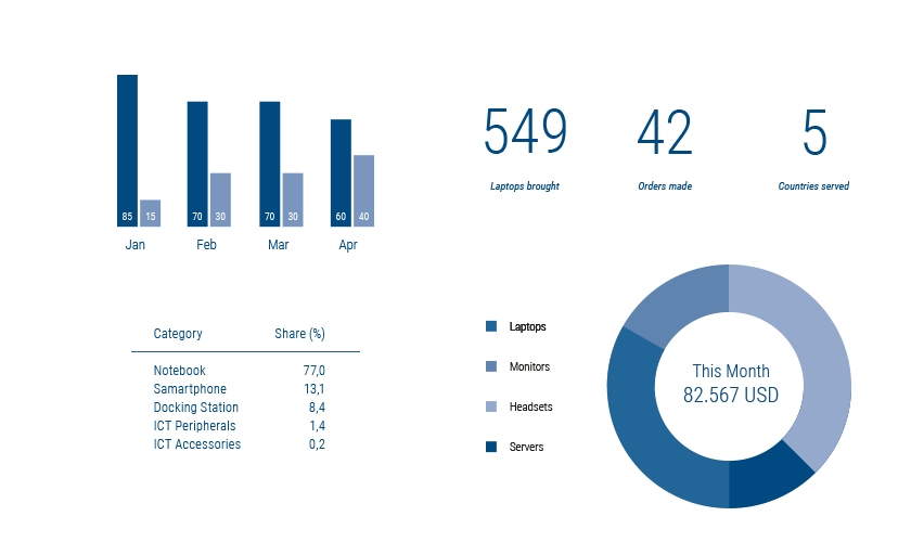 With all purchasing data from multiple companies and countries consolidated into one platform, you’ll always have easy and fast access to pull-out statistics related to your IT purchasing, making your procurement overview simple and efficient. Whether it’s standard metrics like spend by brands or categories or a more detailed view of order volumes, order counts, order history, or active users of the companies associated with your account, your historical data is always within reach in standard formats, ready for export in Excel for further analyses and reports.